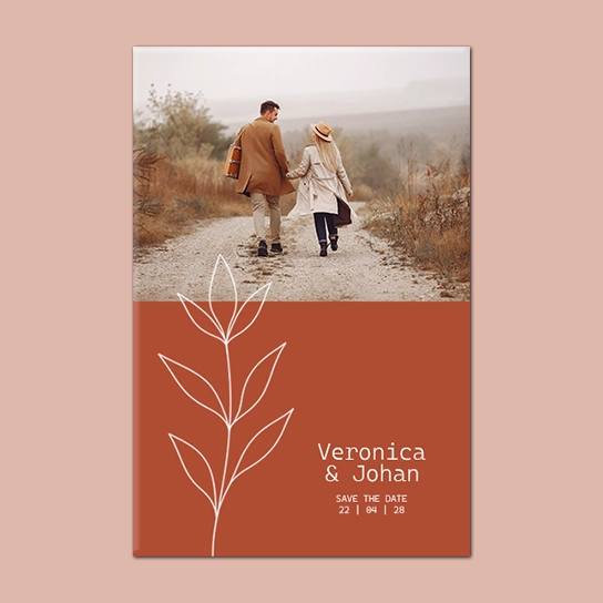 Ce Save the Date « Terracotta Nuit » mêle élégance et modernité. Avec son fond terracotta profond, sa fenêtre arquée lumineuse, et sa fleur minimaliste, il met en valeur votre photo de couple avec douceur.