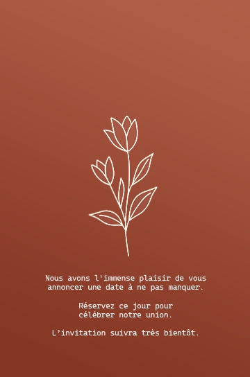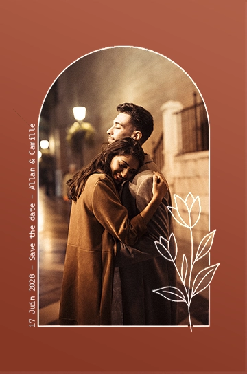 Ce Save the Date « Terracotta Nuit » mêle élégance et modernité. Avec son fond terracotta profond, sa fenêtre arquée lumineuse, et sa fleur minimaliste, il met en valeur votre photo de couple avec douceur.