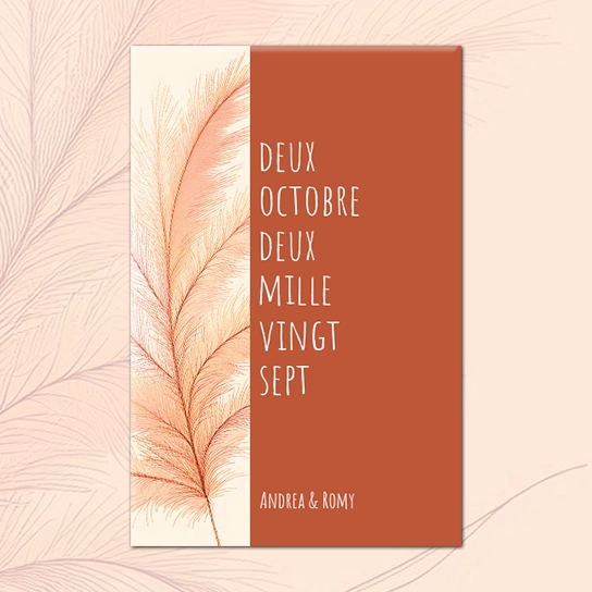 Ce Save the Date « Terracotta Nuit » mêle élégance et modernité. Avec son fond terracotta profond, sa fenêtre arquée lumineuse, et sa fleur minimaliste, il met en valeur votre photo de couple avec douceur.